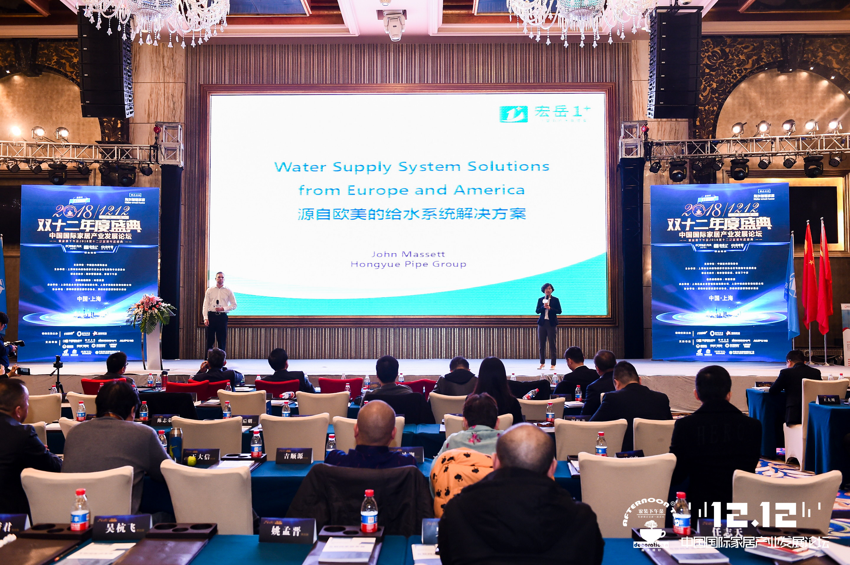 完美1+美国公司技术总监JOHN MASSETT先生在大会现场发表了“源自欧美的给水系统解决方案”的主题演讲,为与会者详尽介绍了PE-Xa零漏点给水系统的性能优势及PE-Xa产品在美国以及国际市场上广泛应用。该系统较目前市场主流给水系统降低70%的风险点,而耐压高67%、耐温高32%。,中英文互译的演讲形式为会议增添了浓厚的国际色彩,也让在场的家装精英们对于国际领先的产品系统与应用技术和完美1+都有了更深的认识与了解,现场反应非常热烈。