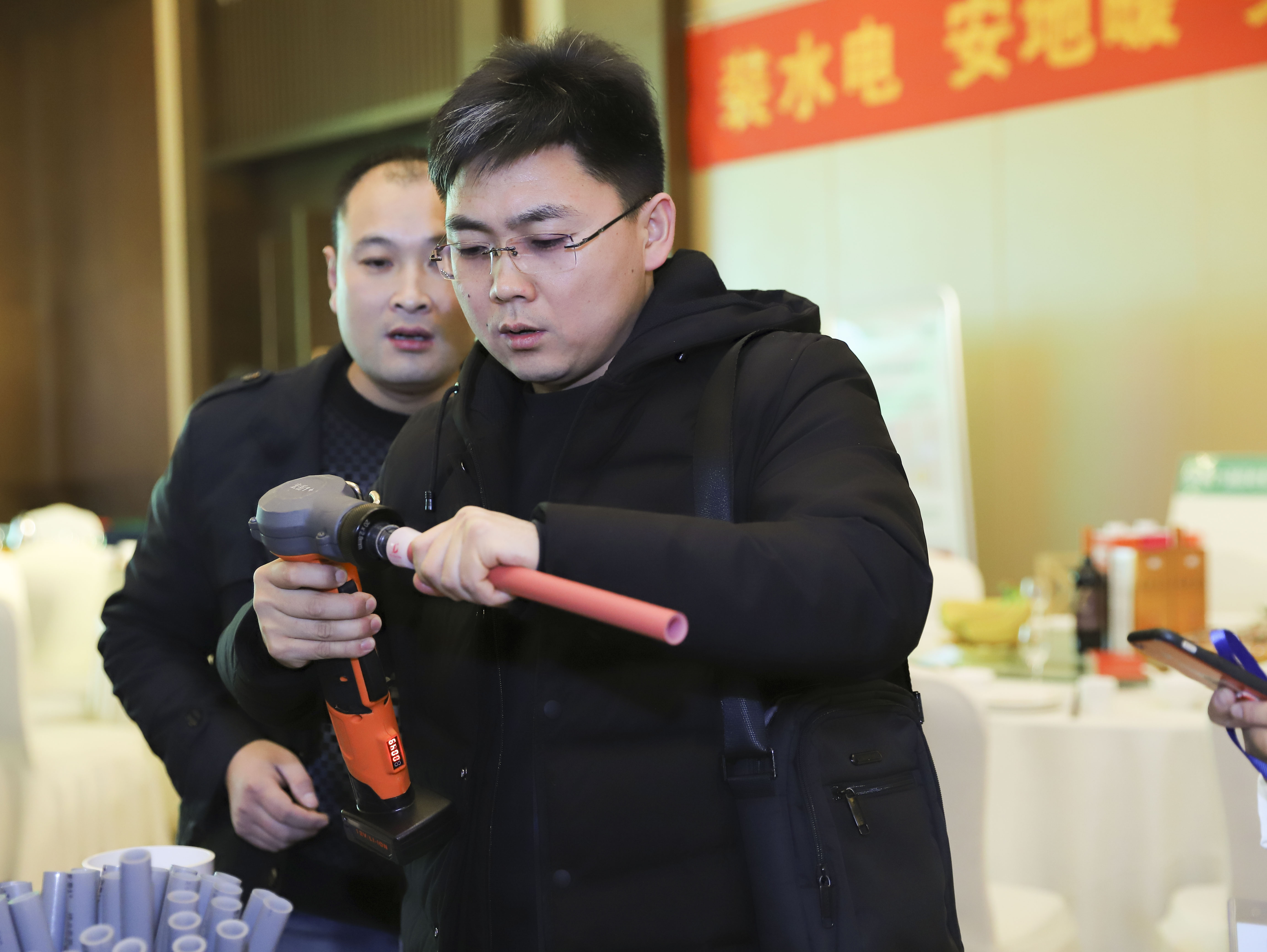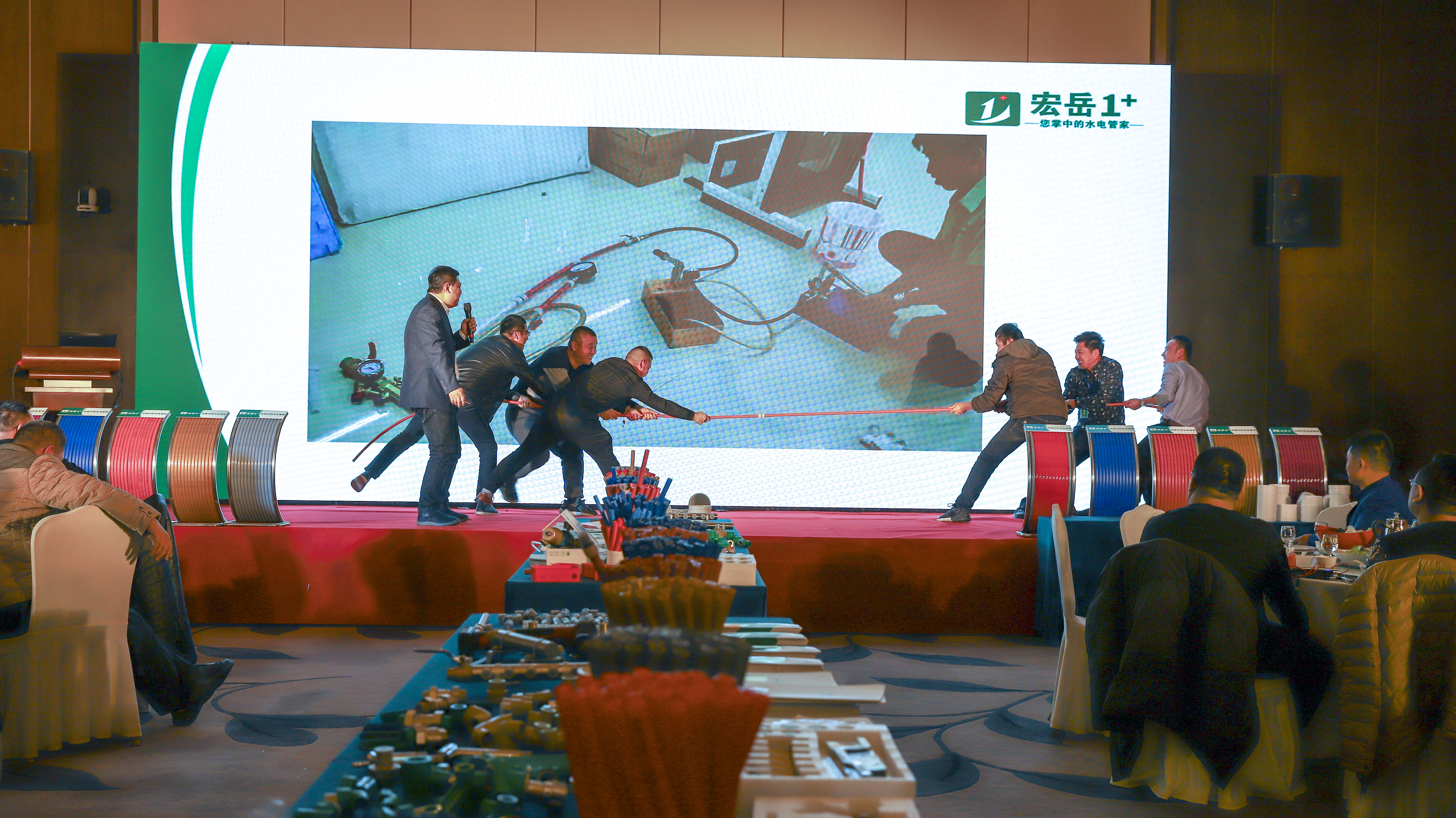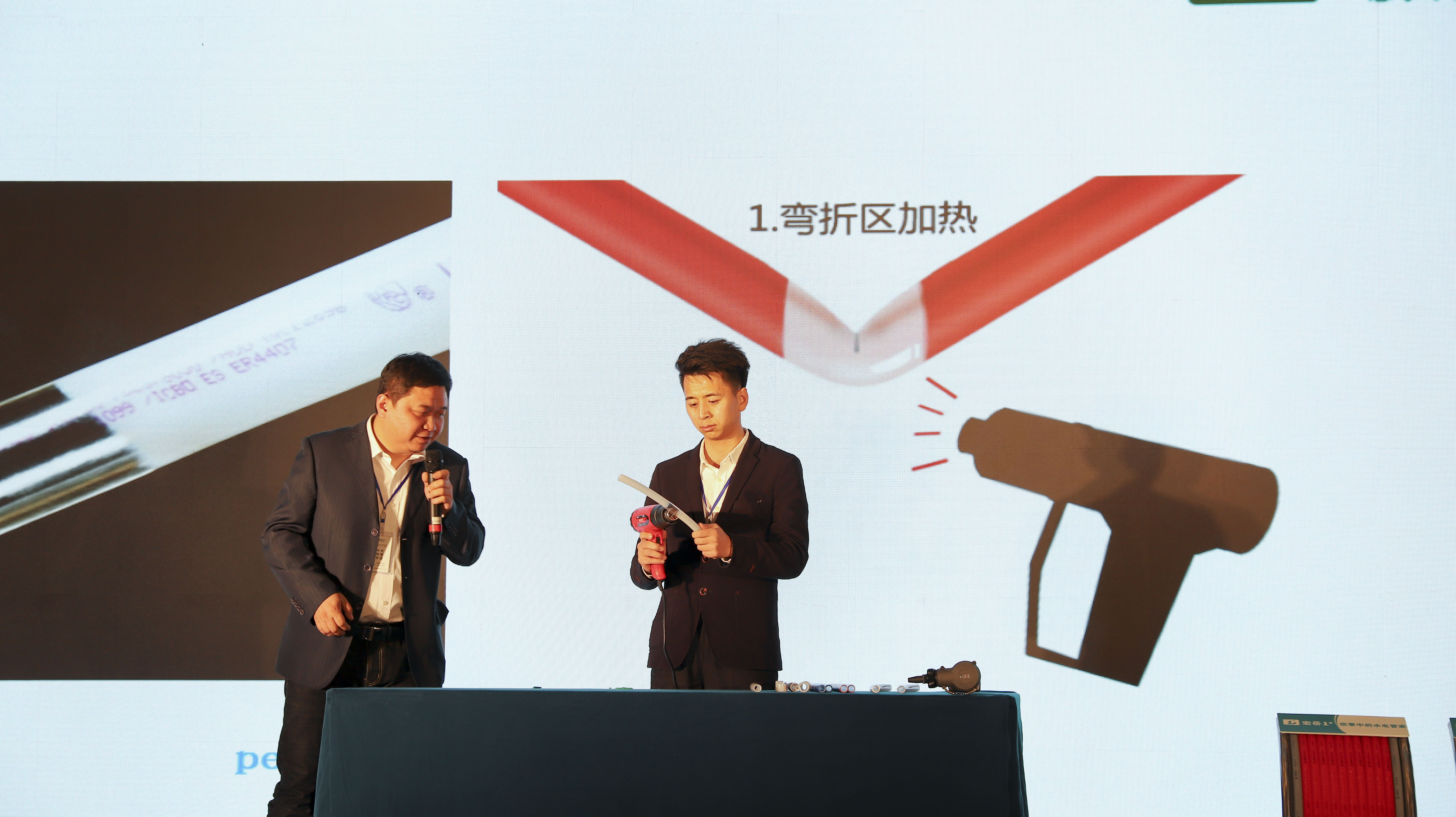 重点提出完美1+PE-Xa给水系统较目前市场主流给水系统降低70%的风险点,耐压高67%,耐温高32%,会上通过现场实验,展现了PE-Xa给水管超强的记忆功能,应对变形折伤加热即可无损复原。