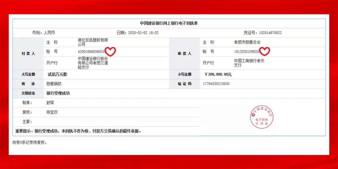 2020年初新型冠状病毒疫情肆虐华中大地,湖北完美塑胶有限公司所在地孝感市是重灾区之一。完美集团心系疫区,多方联络始终无法购置到疫区最急需的防疫物资,经与慈善机构沟通,遂以捐款的形式为社会和政府以尽绵薄之力。当日上述善款已汇入孝感市慈善总会工行孝天支行账户内。