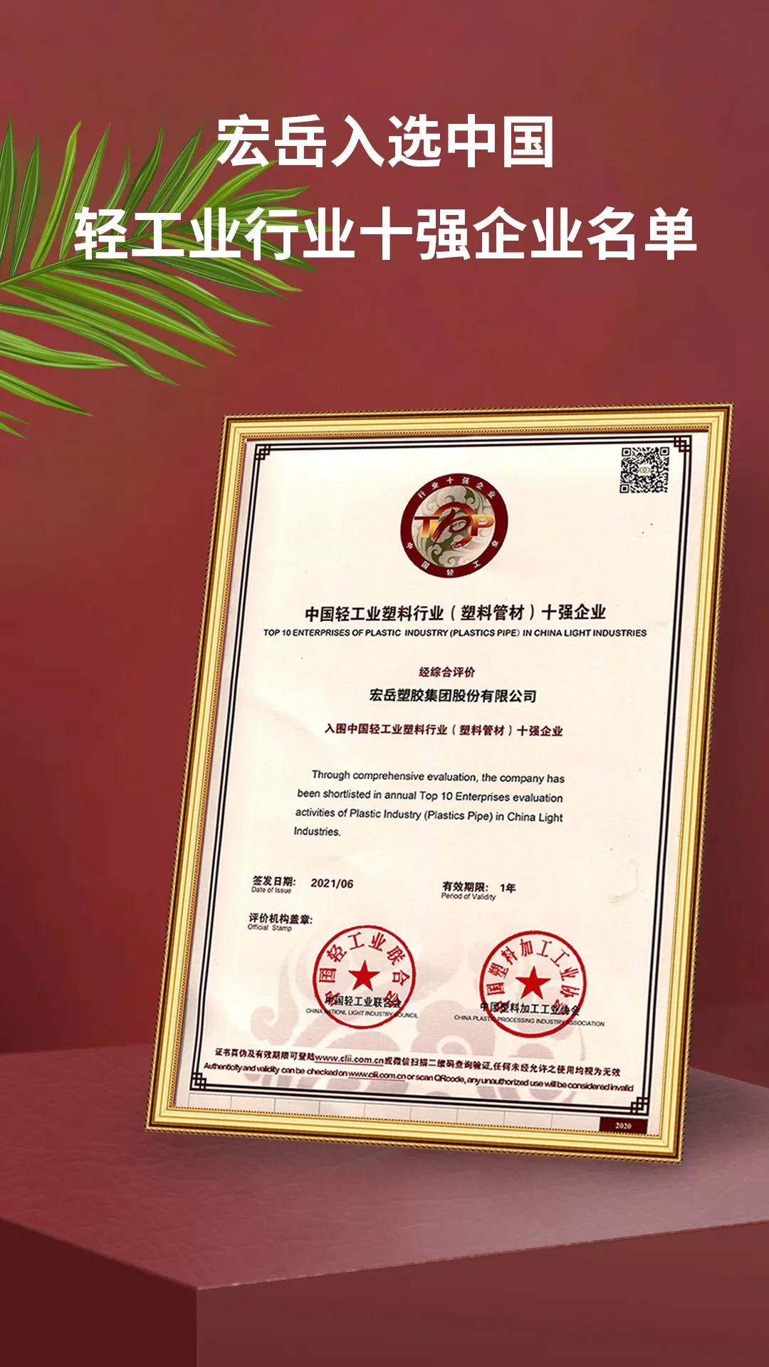 近日,2020年度《中国轻工业行业十强企业》评价结果公示,完美集团再次入选中国轻工业塑料行业 (塑料管材)十强企业名单。接连入选此名单,充分彰显完美集团的雄厚实力和行业地位。